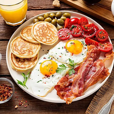 اختيار عصير البرتقال والتفاح والكوكتيل كراسون سلة خبز طازج، خبز دنماركي، خبز توست مربى، مربى، عسل، زبدة اختيارك من البيض المسلوق، الأومليت، المقلي، المخفوق بطاطس هاش براون، سجق لحم بقري، أو لحم بقري مقدد اختيار رقائق الذرة أو كوكو بوبس