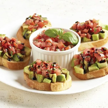 شرائح كروستيني محمصة مغطاة بأفوكادو طازج مطحون. مغطاة بالطماطم الطازجة والريحان ورذاذ بلسميك جليز (حصتين) 205 سعرة حرارية لكل وجبة
