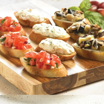طبق عينات من بروشيتا بومودورو ، جبن الماعز الدافئ ، الثوم المعمر ، بروشيتا الفطر البري والباذنجان ، مثالي للمشاركة (4 حصص) 275 سعرة حرارية لكل وجبة